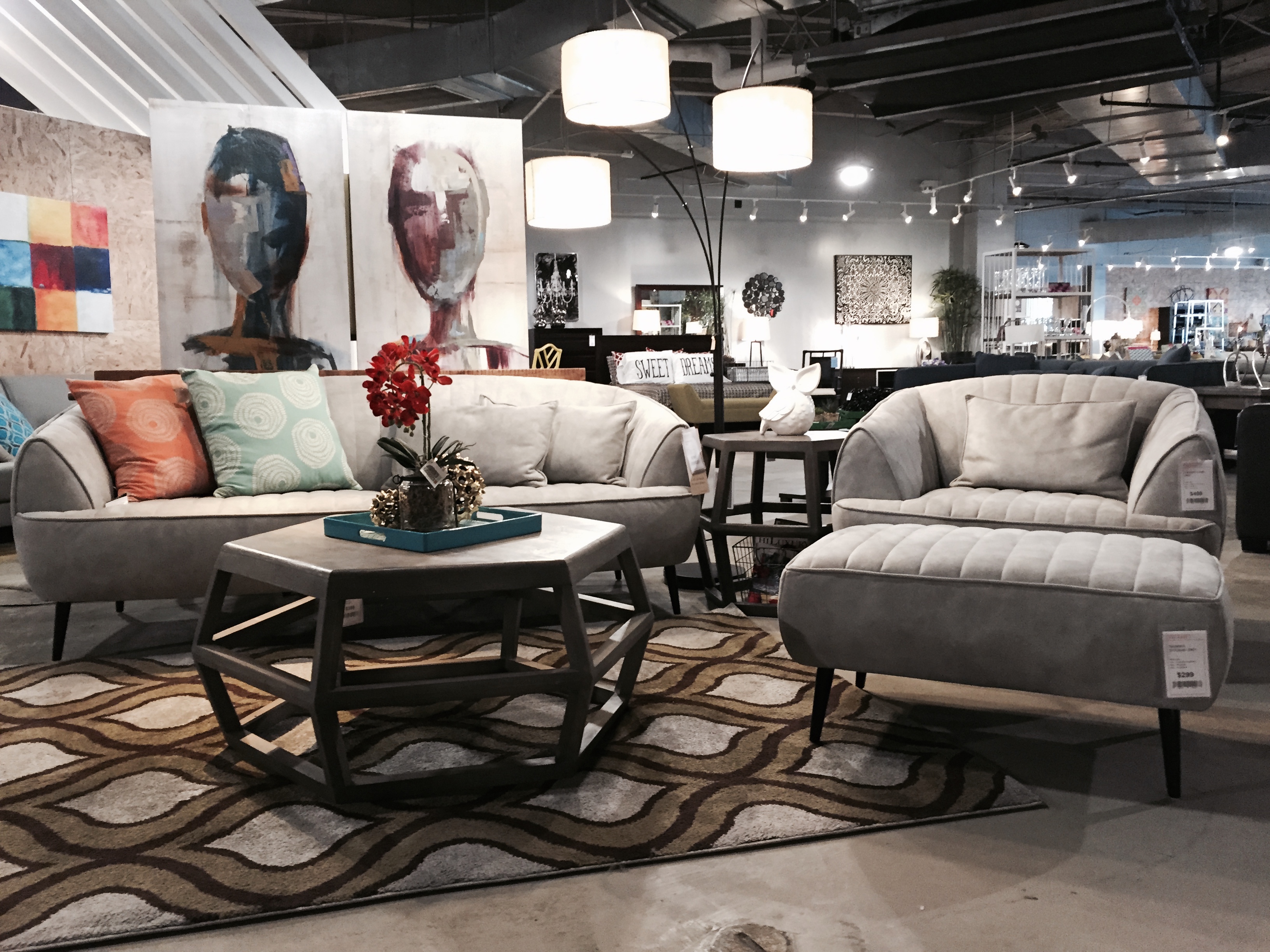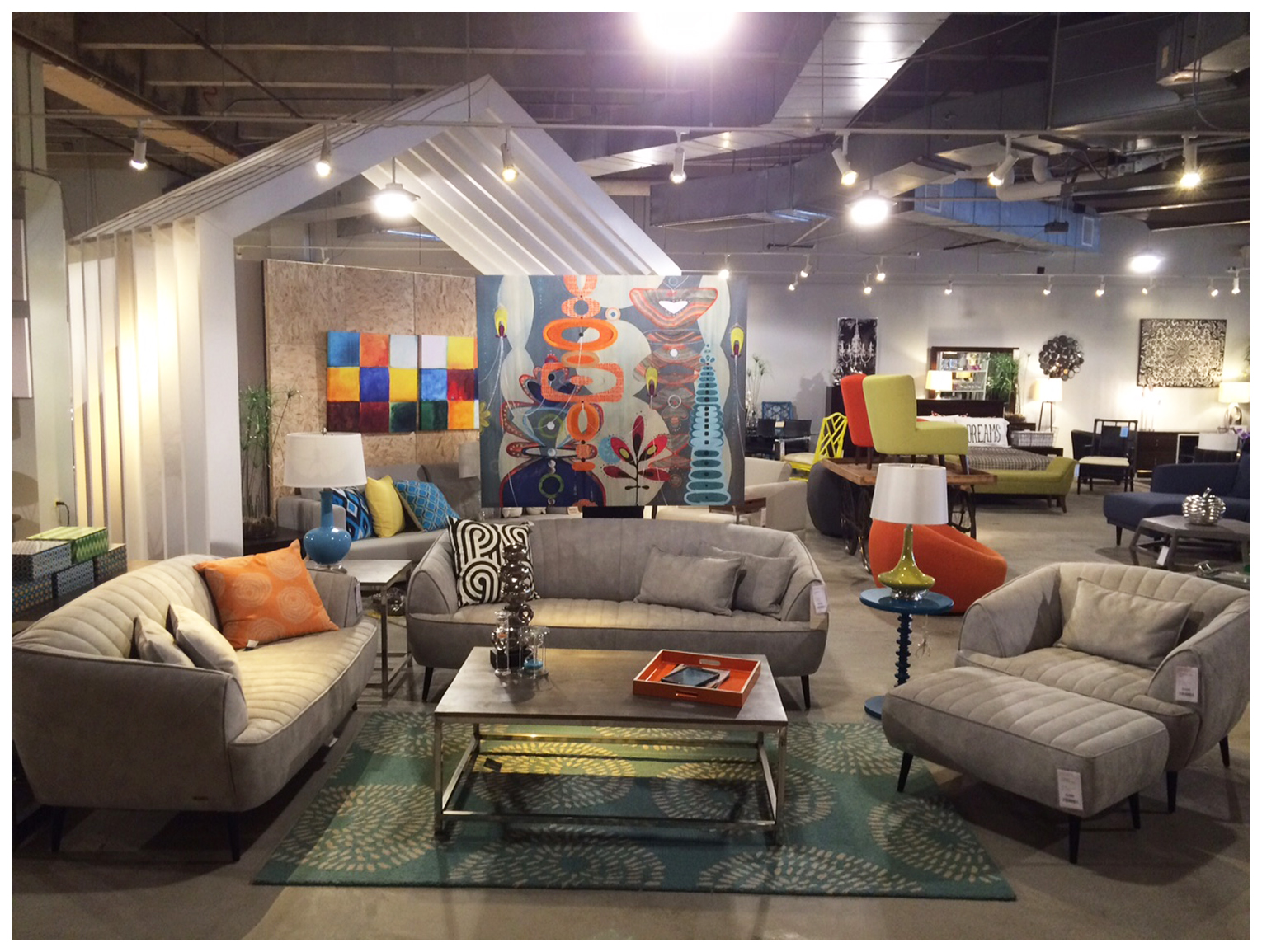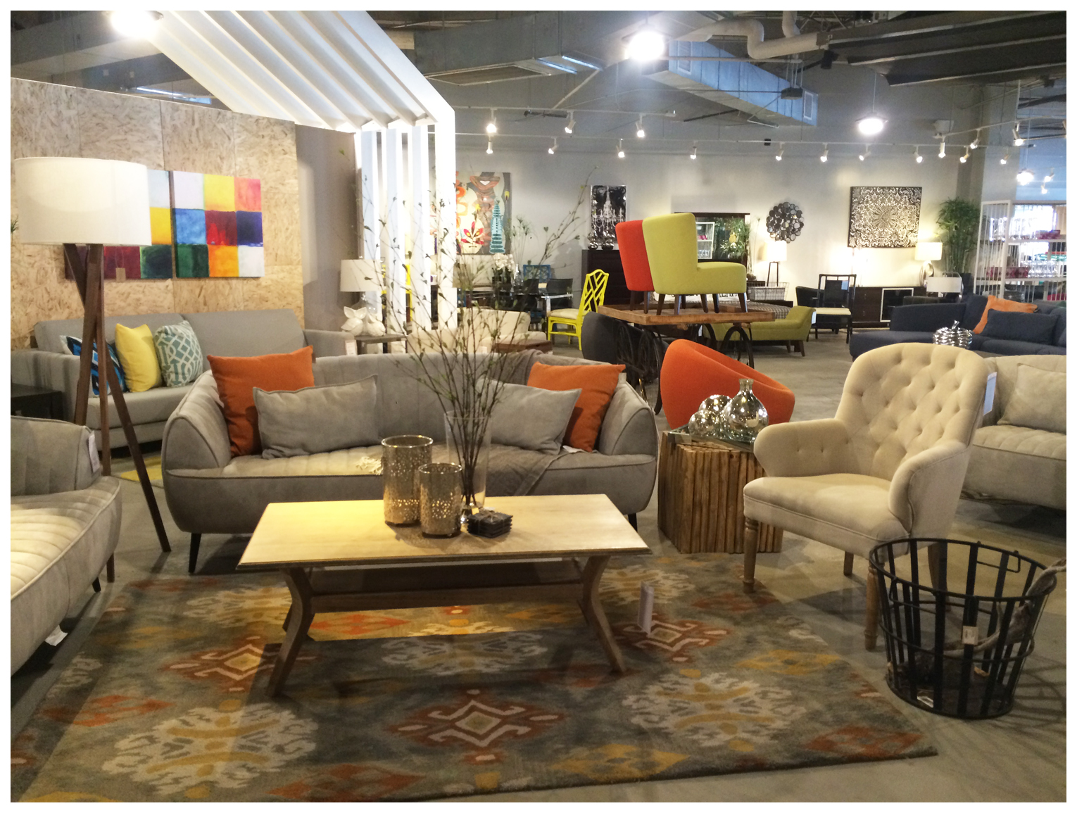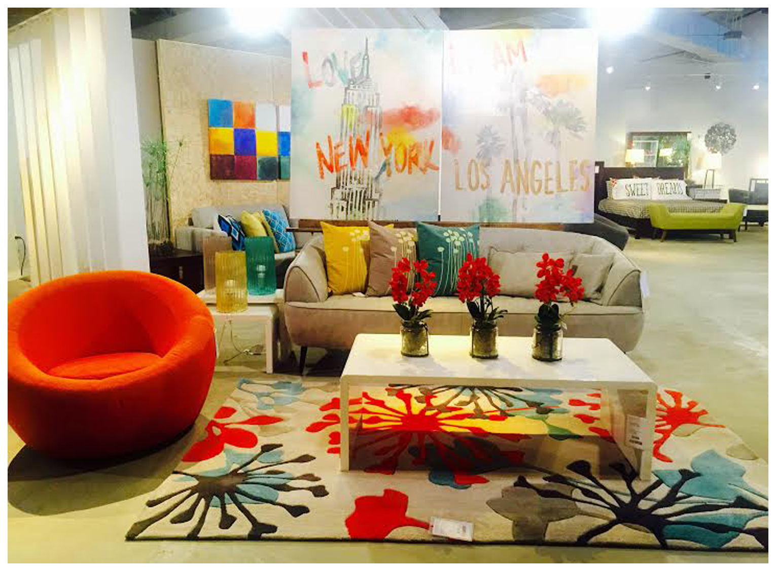 “Starburst has been one of my favorite candies since I was younger, especially the orange flavor. This very modern collection is proof that orange is the new black. I’ve styled up all my favorite items at Red Knot in one look. The Thurman sofa is paired with the York swivel chair and Supernova coffee table topped with three phalaenopsis plants. I also used three different accent pillows and the most popular rug in our store, the Cosmopolitan rug. The hurricane lamps in turquoise, lilac and amber are the icing on the cake. And for final touches I used wall art (LA and NY) to really complement the color scheme of this vignette.” – Jake Javier, Red Knot Pearlridge